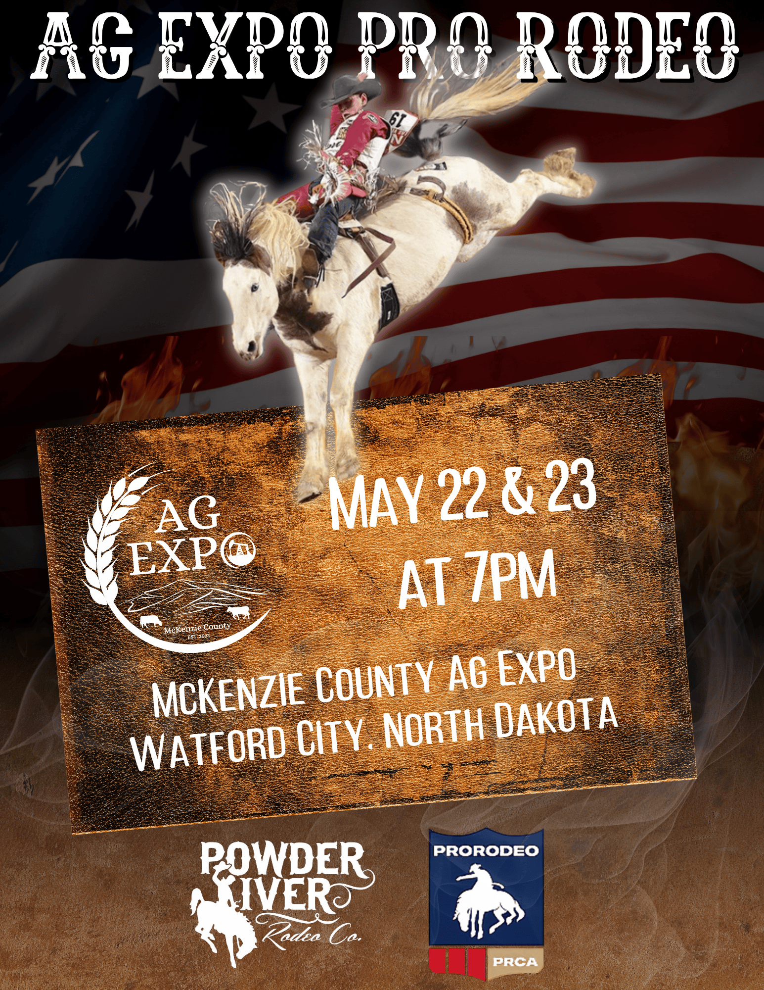 Celebrate Memorial Day weekend at the PRCA Rodeo at the McKenzie County Ag Expo, May 22–23, 2026! Experience two nights of top-tier rodeo action, heart-pounding competition, and all-American fun for the whole family.