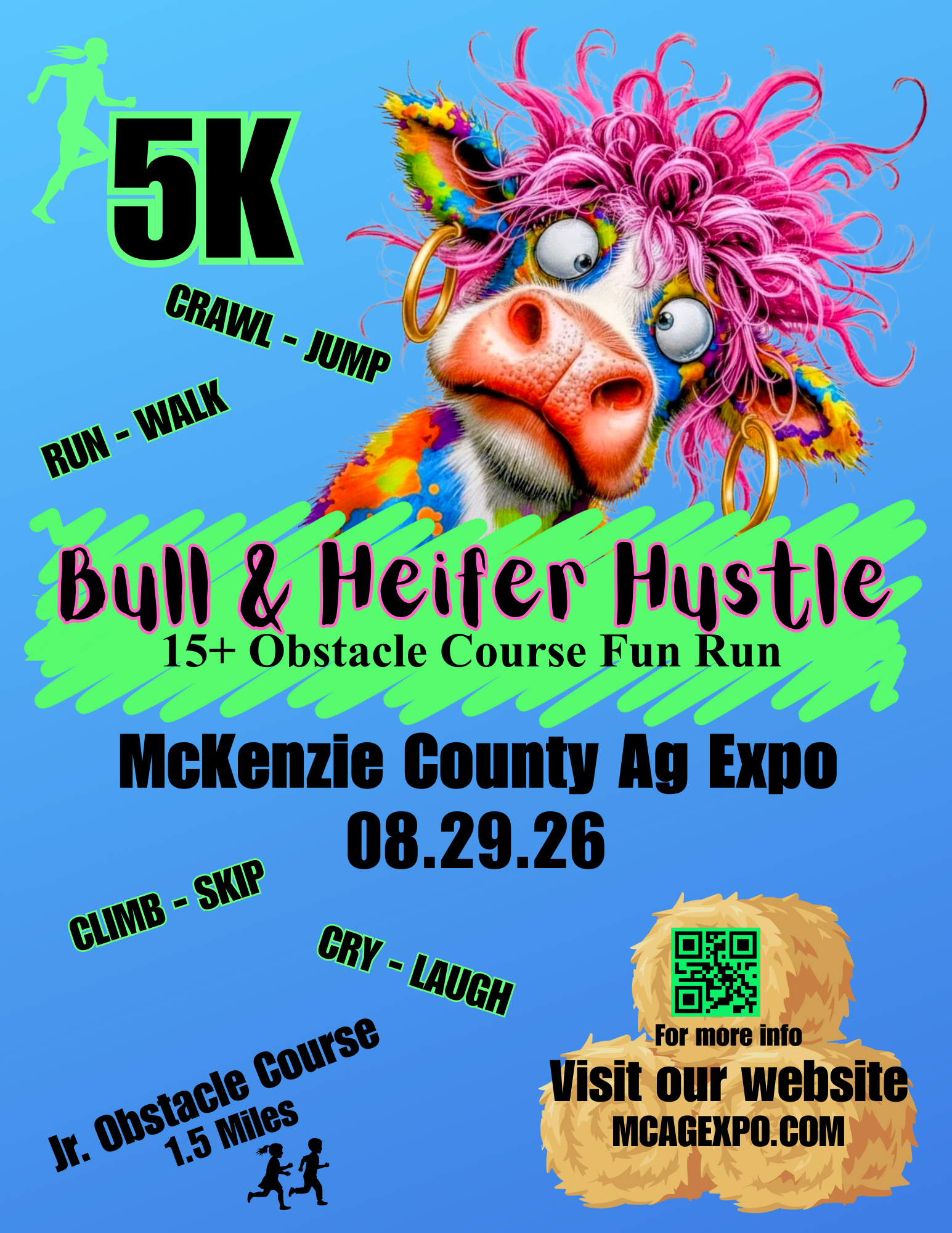 Get ready to run, climb, crawl, and hustle your way through the Bull & Heifer Hustle! This exciting 5K obstacle course is perfect for runners of all levels looking for a challenge and a whole lot of fun. For our younger athletes, the Jr. Obstacle Course offers a 1.5-mile course packed with adventure.